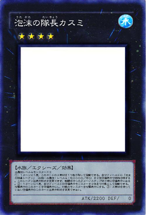| 水属性レベル4モンスター×2 ①:1ターンに1度、このカードのX素材を1つ取り除いて発動できる。自分フィールドに「泡沫の隊員トークン」(水族・水属性・レベル4・攻2000/守0)を2体守備表示で特殊召喚する。このトークンは表示形式を変更できず、戦闘を行ったダメージステップ終了時に守備表示になる。②:1ターンに1度、自分フィールドの守備表示モンスターを2体まで対象として発動できる。攻撃表示のこのカードを守備表示にし、対象のモンスターを攻撃表示にする。③:X素材を持っていない守備表示のこのカードは表示形式を変更できない。 | |||