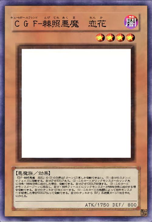 | 「CGF-棘照悪魔 恋花」の(3)の効果は1ターンに1度しか発動できない。(1):自分のスタンバイフェイズに発動する。自分LPを500LP失う。(2):このカードがリンクモンスターのリンク先に召喚・特殊召喚に成功した場合、発動できる。自分LPを1000LP回復する。(3):このカードがモンスターゾーンに存在し、自分・相手フィールドにリンクモンスターが特殊召喚に成功する場合発動できる。自分のデッキから1枚ドローする。(4):このカードの戦闘によって相手モンスターを破壊した場合1000LP払って発動できる。自分のデッキから「GF」永続罠カード1枚を手札に加える。 | |||