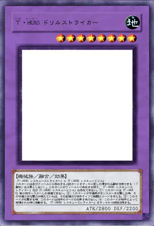 「レスキュードリルとレスキューストライカーが合体したドリル・ストライカー。攻撃名は「ドリルブースト」です。他の「T・HERO」融合モンスターより効果が寂しいので、デッキからレスキューストライカーを呼び出す効果を追加しました。」(2017-05-31 23:32)