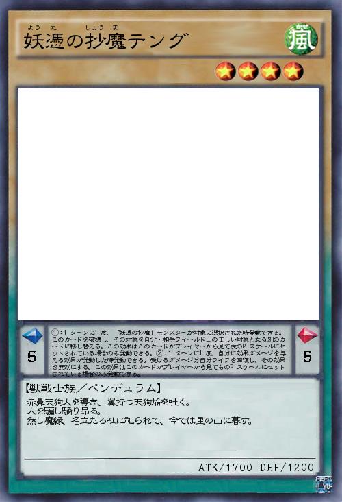| ①:1ターンに1度、「妖憑の抄魔」モンスターが対象に選択された時発動できる。このカードを破壊し、その対象を自分・相手フィールド上の正しい対象となる別のカードに移し替える。この効果はこのカードがプレイヤーから見て左のPスケールにセットされている場合のみ発動できる。②:1ターンに1度、自分に効果ダメージを与える効果が発動した時発動できる。受けるダメージ分自分ライフを回復し、その効果を無効にする。この効果はこのカードがプレイヤーから見て右のPスケールにセットされている場合のみ発動できる。 | |||