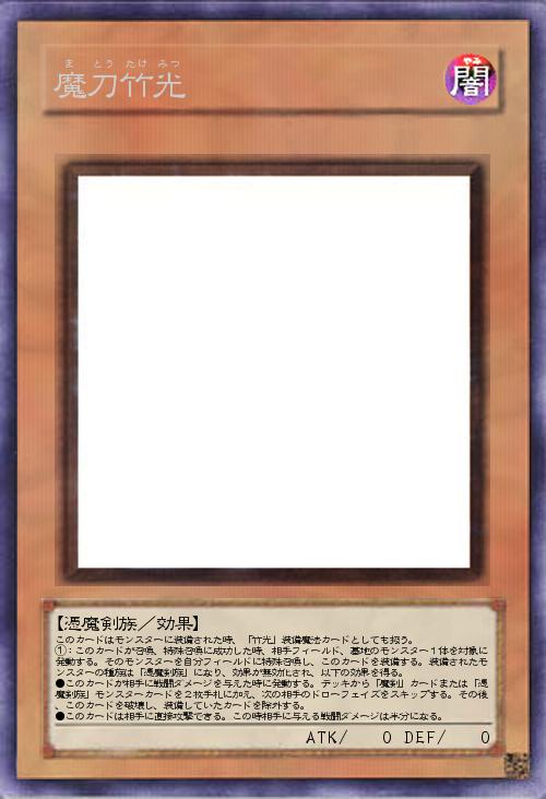 | このカードはモンスターに装備された時、「竹光」装備魔法カードとしても扱う。 ①:このカードが召喚、特殊召喚に成功した時、相手フィールド、墓地のモンスター1体を対象に発動する。そのモンスターを自分フィールドに特殊召喚し、このカードを装備する。装備されたモンスターの種族は「憑魔剣族」になり、効果が無効化され、以下の効果を得る。 ●このカードが相手に戦闘ダメージを与えた時に発動する。デッキから「魔剣」カードまたは「憑魔剣族」モンスターカードを2枚手札に加え、次の相手のドローフェイズをスキップする。その後、このカードを破壊し、装備していたカードを除外する。 ●このカードは相手に直接攻撃できる。この時相手に与える戦闘ダメージは半分になる。 | |||