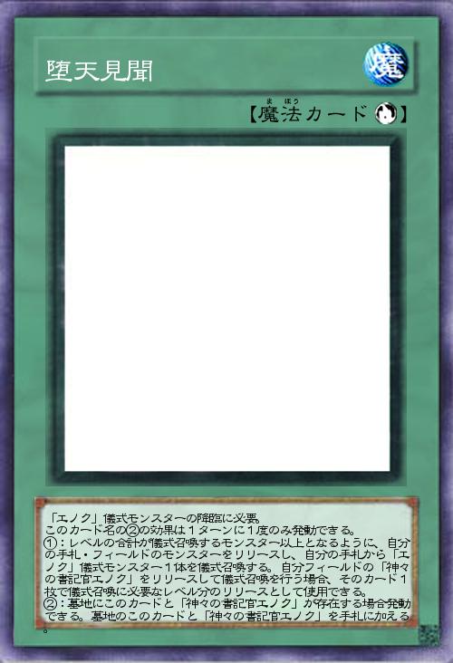 | 「エノク」儀式モンスターの降臨に必要。 このカード名の②の効果は1ターンに1度のみ発動できる。 ①:レベルの合計が儀式召喚するモンスター以上となるように、自分の手札・フィールドのモンスターをリリースし、自分の手札から「エノク」儀式モンスター1体を儀式召喚する。自分フィールドの「神々の書記官エノク」をリリースして儀式召喚を行う場合、そのカード1枚で儀式召喚に必要なレベル分のリリースとして使用できる。 ②:墓地にこのカードと「神々の書記官エノク」が存在する場合発動できる。墓地のこのカードと「神々の書記官エノク」を手札に加える。 | |||