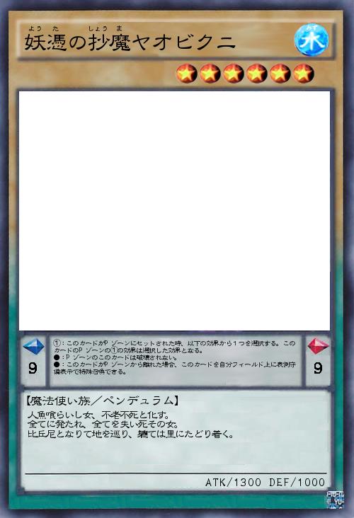 「『人魚の肉とは、不老不死と伝えられる。現にその肉を喰ろうた者として八百比丘尼が存在する。彼女は人魚の肉を喰ろうて不老不死と化した怪異。元は少女の其の女、全国を巡り巡る。』ーーー「抄・異界草子」より 日本の妖怪をテーマにした「妖憑の抄魔」テーマです。十四枚目は不老不死の尼。半上位にしては攻守は不安が残るステータスですが、Pスケールは9と最大級。更に効果で破壊されなくなるという強力な効果。」(2017-06-04 20:01)