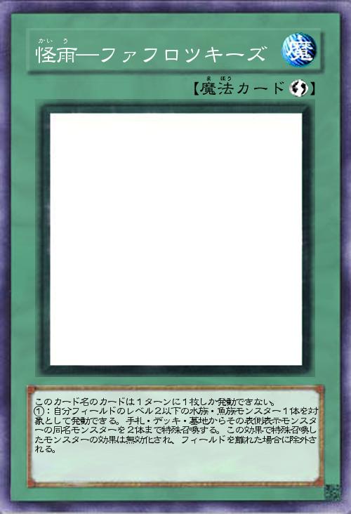 | このカード名のカードは1ターンに1枚しか発動できない。 ①:自分フィールドのレベル2以下の水族・魚族モンスター1体を対象として発動できる。手札・デッキ・墓地からその表側表示モンスターの同名モンスターを2体まで特殊召喚する。この効果で特殊召喚したモンスターの効果は無効化され、フィールドを離れた場合に除外される。 | |||