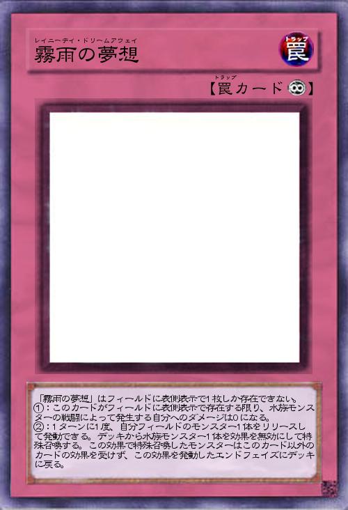 | 「霧雨の夢想」はフィールドに表側表示で1枚しか存在できない。 ①:このカードがフィールドに表側表示で存在する限り、水族モンスターの戦闘によって発生する自分へのダメージは0になる。 ②:1ターンに1度、自分フィールドのモンスター1体をリリースして発動できる。デッキから水族モンスター1体を効果を無効にして特殊召喚する。この効果で特殊召喚したモンスターはこのカード以外のカードの効果を受けず、この効果を発動したエンドフェイズにデッキに戻る。 | |||