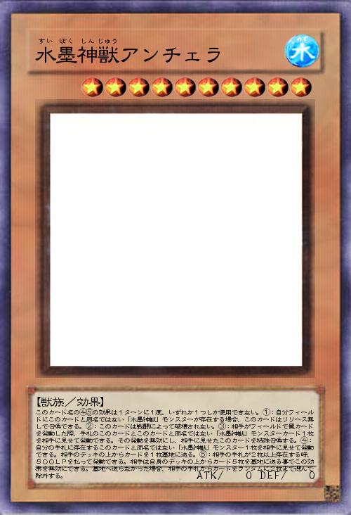 | このカード名の④⑤の効果は1ターンに1度、いずれか1つしか使用できない。①:自分フィールドにこのカードと同名ではない「水墨神獣」モンスターが存在する場合、このカードはリリース無しで召喚できる。②:このカードは戦闘によって破壊されない。③:相手がフィールドで罠カードを発動した際、手札のこのカードとこのカードと同名ではない「水墨神獣」モンスターカード1枚を相手に見せて発動できる。その発動を無効にし、相手に見せたこのカードを特殊召喚する。④:自分の手札に存在するこのカードと同名ではない「水墨神獣」モンスター1枚を相手に見せて発動できる。相手のデッキの上からカードを1枚墓地に送る。⑤:相手の手札が2枚以上存在する時、500LPを払って発動できる。相手は自身のデッキの上からカード5枚を墓地に送る事でこの効果を無効にできる。墓地へ送らなかった場合、相手の手札からカードをランダムに2枚まで選んで除外する | |||
