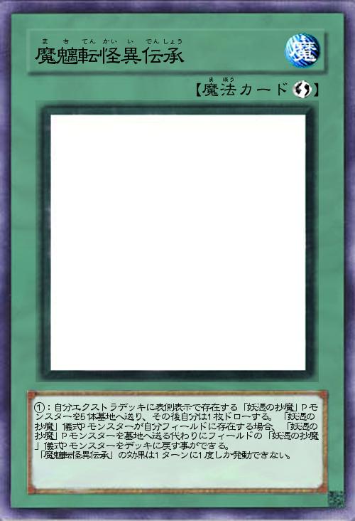 | ①:自分エクストラデッキに表側表示で存在する「妖憑の抄魔」Pモンスターを5体墓地へ送り、その後自分は1枚ドローする。「妖憑の抄魔」儀式Pモンスターが自分フィールドに存在する場合、「妖憑の抄魔」Pモンスターを墓地へ送る代わりにフィールドの「妖憑の抄魔」儀式Pモンスターをデッキに戻す事ができる。 「魔魑転怪異伝承」の効果は1ターンに1度しか発動できない。 | |||