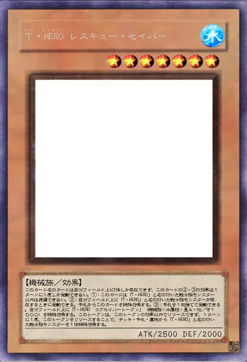 | このカード名のカードは自分フィールド上に1体しか存在できず、このカードの②・③の効果は1ターンに1度しか発動できない。①:このカードは「T・HERO」と名の付いた戦士族モンスター以外は装備できない。②:自分フィールド上に「T・HERO」と名の付いた戦士族モンスターが存在するときに発動できる。手札からこのカードを特殊召喚する。③:手札を1枚捨てて発動できる。自分フィールド上に「T・HERO コアセイバートークン」(機械族・水属性・星4・攻/守1000)を特殊召喚する。このトークンは、このトークンの効果以外でリリースできず、1ターンに1度、このトークンをリリースすることで、デッキ・手札・墓地から「T・HERO」と名の付いた戦士族モンスターを1体特殊召喚する。 | |||