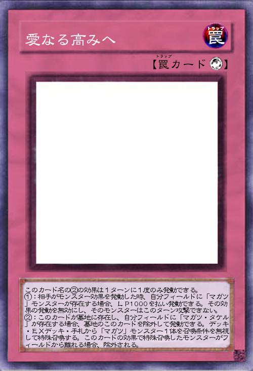 | このカード名の②の効果は1ターンに1度のみ発動できる。 ①:相手がモンスター効果を発動した時、自分フィールドに「マガツ」モンスターが存在する場合、LP1000を払い発動できる。その効果の発動を無効にし、そのモンスターはこのターン攻撃できない。 ②:このカードが墓地に存在し、自分フィールドに「マガツ・タケル」が存在する場合、墓地のこのカードを除外して発動できる。デッキ・EXデッキ・手札から「マガツ」モンスター1体を召喚条件を無視して特殊召喚する。このカードの効果で特殊召喚したモンスターがフィールドから離れる場合、除外される。 | |||