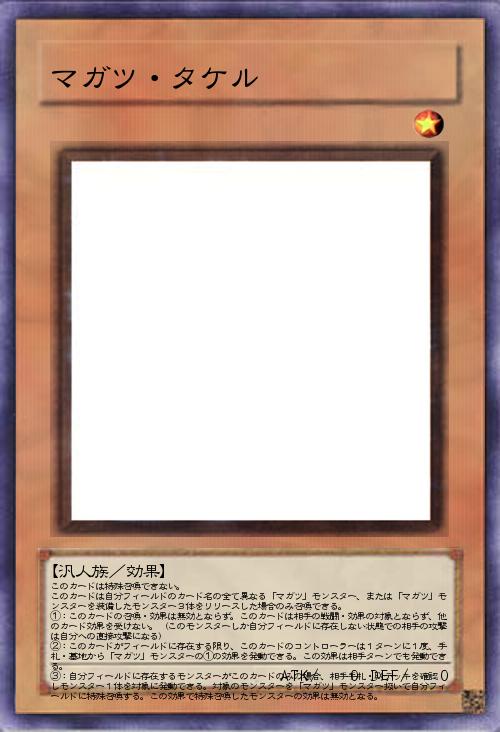 | このカードは特殊召喚できない。 このカードは自分フィールドのカード名の全て異なる「マガツ」モンスター、または「マガツ」モンスターを装備したモンスター3体をリリースした場合のみ召喚できる。 ①:このカードの召喚・効果は無効とならず。このカードは相手の戦闘・効果の対象とならず、他のカード効果を受けない。(このモンスターしか自分フィールドに存在しない状態での相手の攻撃は自分への直接攻撃になる) ②:このカードがフィールドに存在する限り、このカードのコントローラーは1ターンに1度、手札・墓地から「マガツ」モンスターの①の効果を発動できる。この効果は相手ターンでも発動できる。 ③:自分フィールドに存在するモンスターがこのカードのみの場合、相手手札・EXデッキを確認しモンスター1体を対象に発動できる。対象のモンスターを「マガツ」モンスター扱いで自分フィールドに特殊召喚する。この効果で特殊召喚したモンス | |||