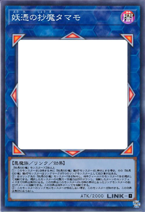 | 「妖憑の抄魔」モンスター×2体以上 ①:このモンスターをL召喚する為に「妖憑の抄魔」儀式PモンスターをL素材とする場合、その「妖憑の抄魔」儀式Pモンスターはリンクマークが3つのリンクモンスターとして扱う事が出来る。 ②:自分リンク先の「妖憑の抄魔」モンスター1体を除外し、相手フィールドのモンスター1体を選択して発動できる。選択したモンスターの攻撃力・守備力は2000ダウンし、発動したターンのエンドフェイズまで効果は無効になる。この効果はこのモンスターのL召喚の素材となったリンクモンスターの数だけ1ターンに発動できる。この効果は相手ターンでも発動できる。 ③:このモンスターのリンク先にモンスターが存在しない場合、このモンスターを除外する。この効果は無効にならない。 | |||