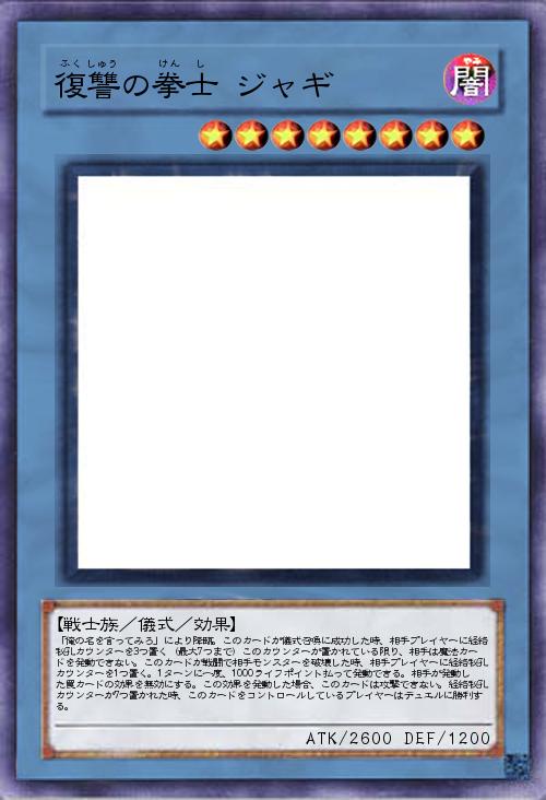 | 「俺の名を言ってみろ」により降臨。このカードが儀式召喚に成功した時、相手プレイヤーに経絡秘孔カウンターを3つ置く(最大7つまで)このカウンターが置かれている限り、相手は魔法カードを発動できない。このカードが戦闘で相手モンスターを破壊した時、相手プレイヤーに経絡秘孔カウンターを1つ置く。1ターンに一度、1000ライフポイント払って発動できる。相手が発動した罠カードの効果を無効にする。この効果を発動した場合、このカードは攻撃できない。経絡秘孔カウンターが7つ置かれた時、このカードをコントロールしているプレイヤーはデュエルに勝利する。 | |||