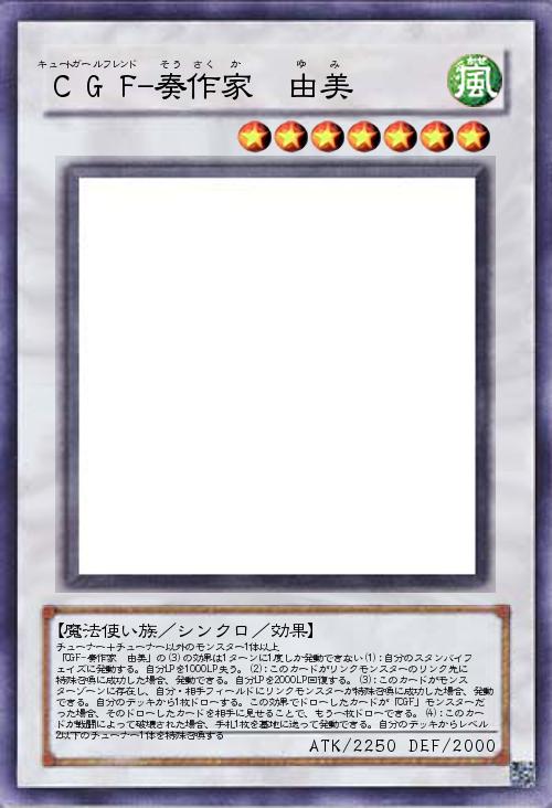 | チューナー+チューナー以外のモンスター1体以上 「CGF-奏作家 由美」の(3)の効果は1ターンに1度しか発動できない(1):自分のスタンバイフェイズに発動する。自分LPを1000LP失う。(2):このカードがリンクモンスターのリンク先に特殊召喚に成功した場合、発動できる。自分LPを2000LP回復する。(3):このカードがモンスターゾーンに存在し、自分・相手フィールドにリンクモンスターが特殊召喚に成功した場合、発動できる。自分のデッキから1枚ドローする。この効果でドローしたカードが「CGF」モンスターだった場合、そのドローしたカードを相手に見せることで、もう一枚ドローできる。(4):このカードが戦闘によって破壊された場合、手札1枚を墓地に送って発動できる。自分のデッキからレベル2以下のチューナー1体を特殊召喚する | |||
