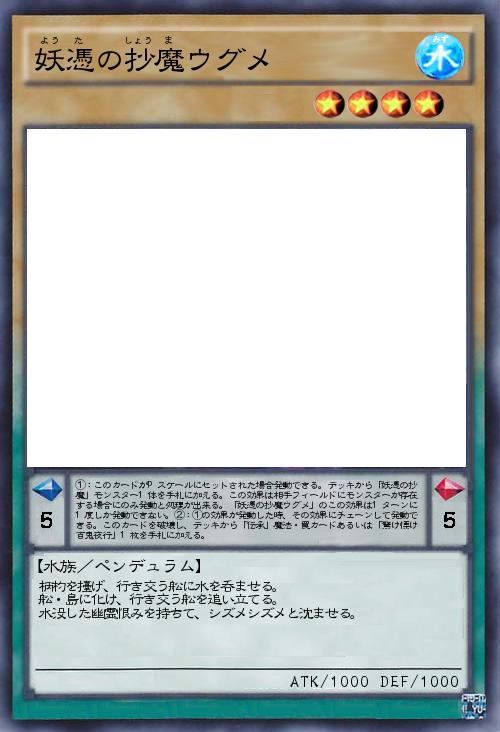 | ①:このカードがPスケールにセットされた場合発動できる。デッキから「妖憑の抄魔」モンスター1体を手札に加える。この効果は相手フィールドにモンスターが存在する場合にのみ発動と処理が出来る。「妖憑の抄魔ウグメ」のこの効果は1ターンに1度しか発動できない。②:①の効果が発動した時、その効果にチェーンして発動できる。このカードを破壊し、デッキから「伝承」魔法・罠カードあるいは「驚け慄け百鬼夜行」1枚を手札に加える。 | |||