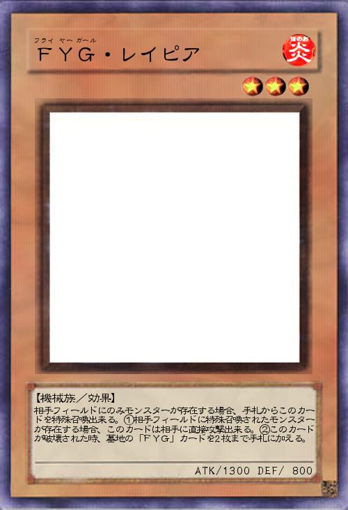 | 相手フィールドにのみモンスターが存在する場合、手札からこのカードを特殊召喚出来る。①相手フィールドに特殊召喚されたモンスターが存在する場合、このカードは相手に直接攻撃出来る。②このカードが破壊された時、墓地の「FYG」カードを2枚まで手札に加える。 | |||
