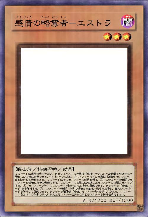 | このカードは通常召喚できない。自分フィールドの光属性「感情」モンスターが戦闘で破壊された場合にのみ特殊召喚できる。①:1ターンに1度、手札・フィールドの光属性「感情」モンスター1体を除外して発動できる。このカードはそのモンスターの効果を得る。②:このカードが戦闘でモンスターを破壊した時に発動できる。このカードの攻撃力は破壊したモンスターの攻撃力分アップする。③:モンスターゾーンのこのカードが除外された場合に発動できる。デッキから「感情」カード1枚を除外する。④:このカードが戦闘・効果で破壊され墓地へ送られた場合、墓地のこのカードを除外して発動できる。デッキから闇属性「感情」モンスター1体を手札に加える。このターン、自分はこの効果で手札に加えたモンスター及びその同名モンスターを特殊召喚できない。 | |||