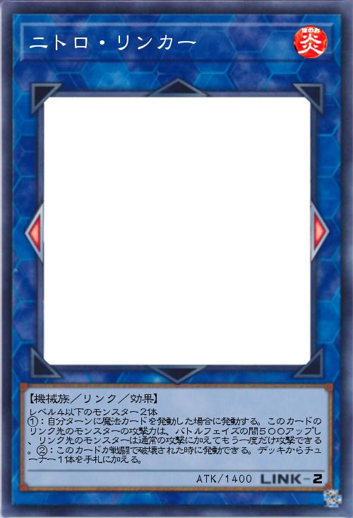 | レベル4以下のモンスター2体 ①:自分ターンに魔法カードを発動した場合に発動する。このカードのリンク先のモンスターの攻撃力は、バトルフェイズの間500アップし、リンク先のモンスターは通常の攻撃に加えてもう一度だけ攻撃できる。②:このカードが戦闘で破壊された時に発動できる。デッキからチューナー1体を手札に加える。 | |||
