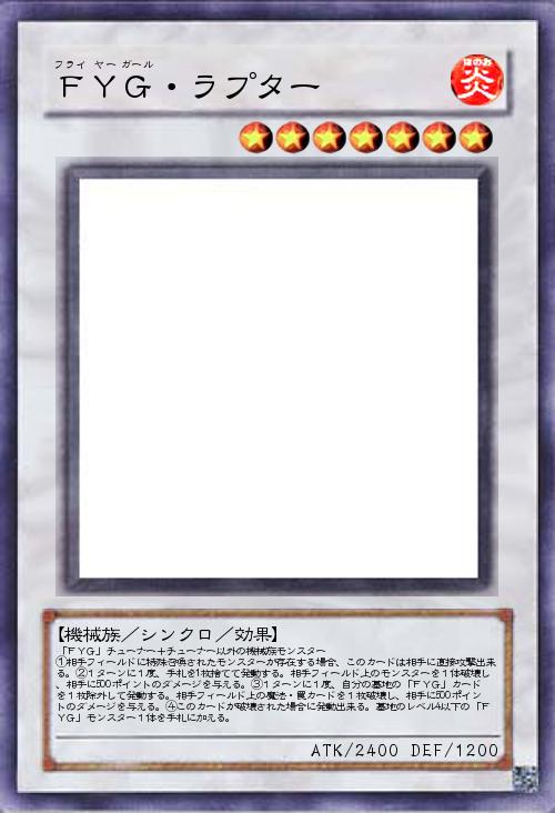 | 「FYG」チューナー+チューナー以外の機械族モンスター ①相手フィールドに特殊召喚されたモンスターが存在する場合、このカードは相手に直接攻撃出来る。②1ターンに1度、手札を1枚捨てて発動する。相手フィールド上のモンスターを1体破壊し、相手に500ポイントのダメージを与える。③1ターンに1度、自分の墓地の「FYG」カードを1枚除外して発動する。相手フィールド上の魔法・罠カードを1枚破壊し、相手に500ポイントのダメージを与える。④このカードが破壊された場合に発動出来る。墓地のレベル4以下の「FYG」モンスター1体を手札に加える。 | |||