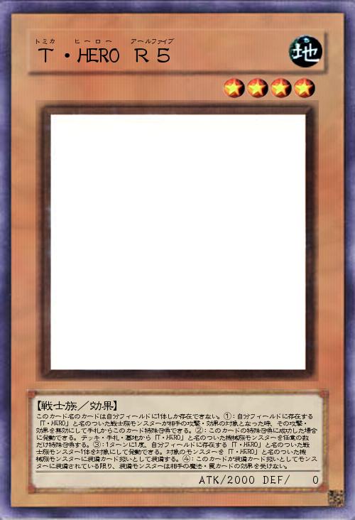 | このカード名のカードは自分フィールドに1体しか存在できない。①:自分フィールドに存在する「T・HERO」と名のついた戦士族モンスターが相手の攻撃・効果の対象となった時、その攻撃・効果を無効にして手札からこのカード特殊召喚できる。②:このカードの特殊召喚に成功した場合に発動できる。デッキ・手札・墓地から「T・HERO」と名のついた機械族モンスターを任意の数だけ特殊召喚する。③:1ターンに1度、自分フィールドに存在する「T・HERO」と名のついた戦士族モンスター1体を対象にして発動できる。対象のモンスターを「T・HERO」と名のついた機械族モンスターに装備カード扱いとして装備する。④:このカードが装備カード扱いとしてモンスターに装備されている限り、装備モンスターは相手の魔法・罠カードの効果を受けない。 | |||