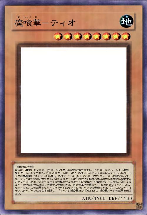 | 【植物族/効果】 自分は「魔喰」モンスターを1ターンに1度しか特殊召喚できない。このカードはルール上「蟲惑魔」カードとしても扱う。①:このカードは、自分・相手バトルフェイズに自分フィールドの「ティオの蟲惑魔」1体をデッキに戻し、相手フィールドのモンスター1体をリリースした場合のみ手札・デッキから特殊召喚できる。②:このカードが①の方法で特殊召喚に成功した場合に発動する。リリースしたモンスターの元々の攻撃力分このカードの攻撃力・守備力をアップする。③:このカードが特殊召喚に成功した場合に発動できる。自分の墓地の罠カード1枚を自分フィールド上にセットする。この効果でセットしたカードはセットしたターンでも発動できる。④:このカードはモンスターゾーンに存在する限り、「ホール」通常罠及び「落とし穴」通常罠カードの効果を受けない。 | |||