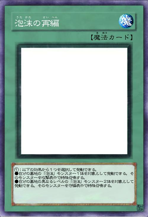 | ①:以下の効果から1つを選択して発動できる。 ●自分の墓地の「泡沫」モンスター1体を対象として発動できる。そのモンスターを攻撃表示で特殊召喚する。 ●自分の墓地の異なるレベルの「泡沫」モンスター2体を対象として発動できる。そのモンスターを守備表示で特殊召喚する。 | |||