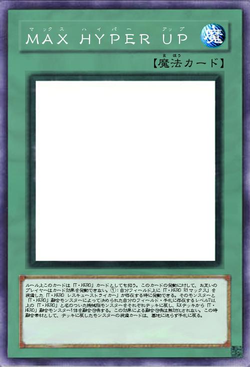 | ルール上このカードは「T・HERO」カードとしても扱う。このカードの発動に対して、お互いのプレイヤーはカード効果を発動できない。①:自分フィールド上に「T・HERO R1マックス」を装備した「T・HERO レスキューストライカー」が存在する時に発動できる。そのモンスターと「T・HERO」融合モンスターによって決められた自分のフィールド・手札に存在するレベル7以上の「T・HERO」と名のついた機械族モンスターをそれぞれデッキに戻し、EXデッキから「T・HERO」融合モンスター1体を融合召喚する。この効果による融合召喚は無効化されない。この時融合素材として、デッキに戻したモンスターの装備カードは、墓地に送らず手札に戻る。 | |||