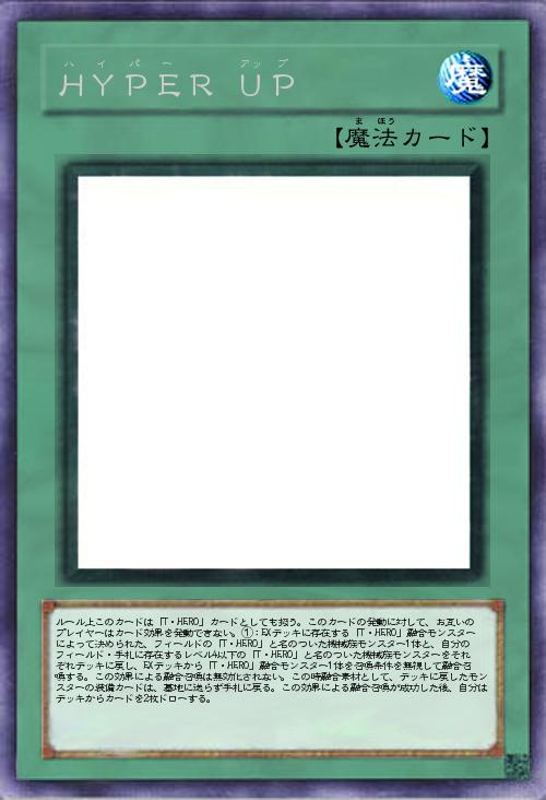 | ルール上このカードは「T・HERO」カードとしても扱う。このカードの発動に対して、お互いのプレイヤーはカード効果を発動できない。①:EXデッキに存在する「T・HERO」融合モンスターによって決められた、フィールドの「T・HERO」と名のついた機械族モンスター1体と、自分のフィールド・手札に存在するレベル4以下の「T・HERO」と名のついた機械族モンスターをそれぞれデッキに戻し、EXデッキから「T・HERO」融合モンスター1体を召喚条件を無視して融合召喚する。この効果による融合召喚は無効化されない。この時融合素材として、デッキに戻したモンスターの装備カードは、墓地に送らず手札に戻る。この効果による融合召喚が成功した後、自分はデッキからカードを2枚ドローする。 | |||