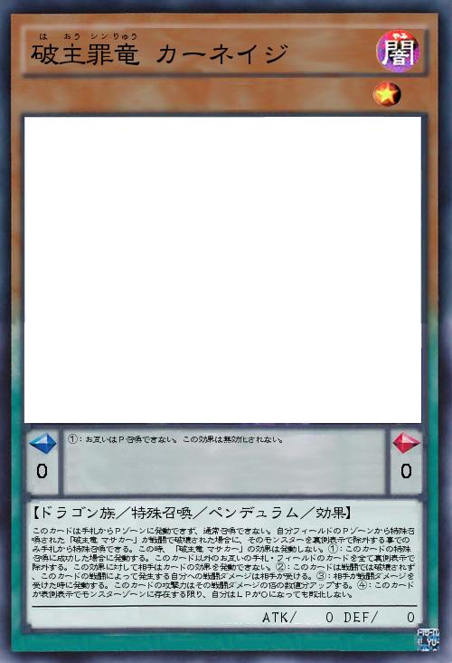 | このカードは手札からPゾーンに発動できず、通常召喚できない。自分フィールドのPゾーンから特殊召喚された「破主竜 マサカー」が戦闘で破壊された場合に、そのモンスターを裏側表示で除外する事でのみ手札から特殊召喚できる。この時、「破主竜 マサカー」の効果は発動しない。①:このカードの特殊召喚に成功した場合に発動する。このカード以外のお互いの手札・フィールドのカードを全て裏側表示で除外する。この効果に対して相手はカードの効果を発動できない。②:このカードは戦闘では破壊されず、このカードの戦闘によって発生する自分への戦闘ダメージは相手が受ける。③:相手が戦闘ダメージを受けた時に発動する。このカードの攻撃力はその戦闘ダメージの倍の数値分アップする。④:このカードが表側表示でモンスターゾーンに存在する限り、自分はLPが0になっても敗北しない。 | |||