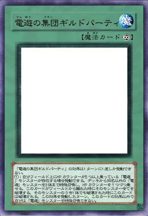 | 「電遊の集団ギルドパーティ」の効果は1ターンに1度しか発動できない。 ①:自分フィールド上にHPカウンターが2つ以上乗っている「電遊」モンスターが存在する場合発動できる。デッキから同名以外の「電遊」モンスターを3体まで特殊召喚し、HPカウンターを1つづつ乗せる。このカードがフィールドから離れた時にそのモンスター全てを破壊する。そのモンスターのうち1体でも破壊された時にこのカードは破壊される。この効果を発動したターン、このカードの効果以外で自分は「電遊」モンスターを特殊召喚できない。 | |||