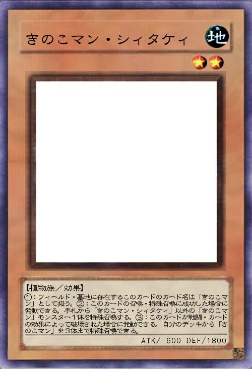 | ①:フィールド・墓地に存在するこのカードのカード名は「きのこマン」として扱う。②:このカードの召喚・特殊召喚に成功した場合に発動できる。手札から「きのこマン・シィタケィ」以外の「きのこマン」モンスター1体を特殊召喚する。③:このカードが戦闘・カードの効果によって破壊された場合に発動できる。自分のデッキから「きのこマン」を3体まで特殊召喚できる。 | |||