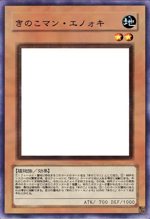 | ①:フィールド・墓地に存在するこのカードのカード名は「きのこマン」として扱う。②:相手モンスターの攻撃宣言時、自分フィールドに「きのこ」カードが2枚以上ある場合に発動できる。手札のこのカードを特殊召喚し、そのバトルフェイズを終了させる。その後、相手フィールドの表側表示のモンスター全てにきのこカウンターを1個置く。きのこカウンターを置かれたモンスターの種族・属性は植物族・地属性になり、カード名は「きのこ」になる。③:このカードが墓地に送られた場合に発動できる。自分の墓地から「きのこマン・エノォキ」以外の「きのこ」カード1枚を手札に加える。 | |||