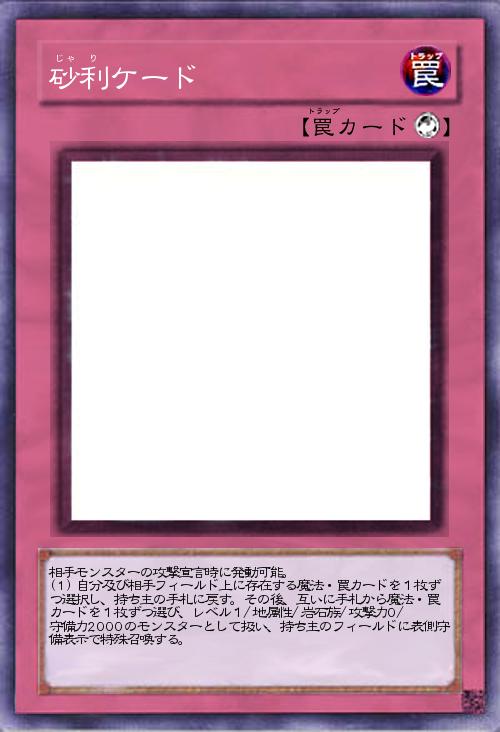 | 相手モンスターの攻撃宣言時に発動可能。 (1)自分及び相手フィールド上に存在する魔法・罠カードを1枚ずつ選択し、持ち主の手札に戻す。その後、互いに手札から魔法・罠 カードを1枚ずつ選び、レベル1/地属性/岩石族/攻撃力0/ 守備力2000のモンスターとして扱い、持ち主のフィールドに表側守備表示で特殊召喚する。 | |||