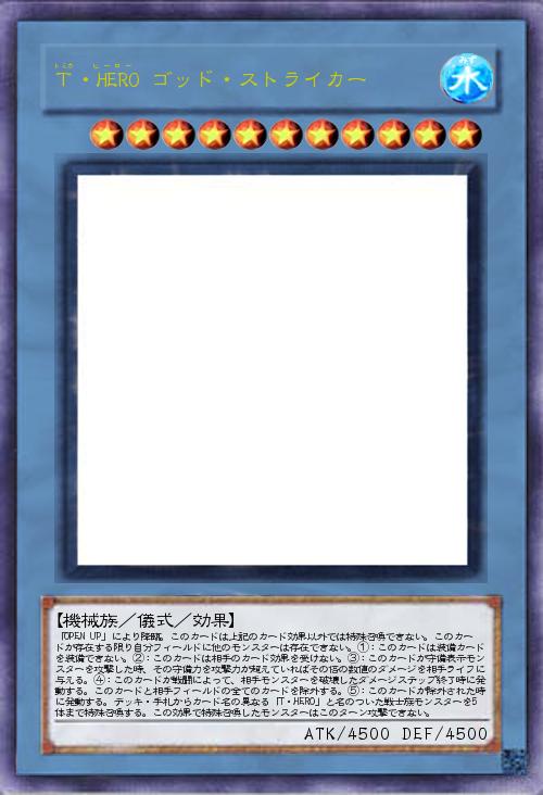 | 「OPEN UP」により降臨。このカードは上記のカード効果以外では特殊召喚できない。このカードが存在する限り自分フィールドに他のモンスターは存在できない。①:このカードは装備カードを装備できない。②:このカードは相手のカード効果を受けない。③:このカードが守備表示モンスターを攻撃した時、その守備力を攻撃力が超えていればその倍の数値のダメージを相手ライフに与える。④:このカードが戦闘によって、相手モンスターを破壊したダメージステップ終了時に発動する。このカードと相手フィールドの全てのカードを除外する。⑤:このカードが除外された時に発動する。デッキ・手札からカード名の異なる「T・HERO」と名のついた戦士族モンスターを5体まで特殊召喚する。この効果で特殊召喚したモンスターはこのターン攻撃できない。 | |||