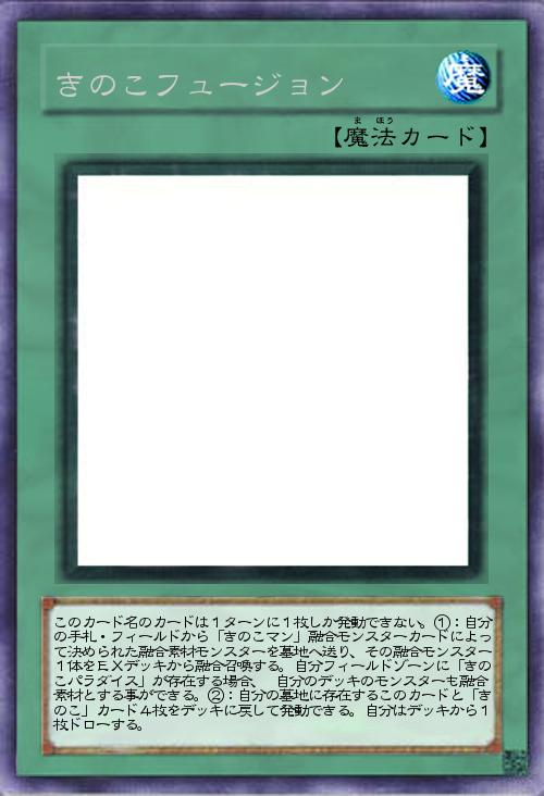 | このカード名のカードは1ターンに1枚しか発動できない。①:自分の手札・フィールドから「きのこマン」融合モンスターカードによって決められた融合素材モンスターを墓地へ送り、その融合モンスター1体をEXデッキから融合召喚する。自分フィールドゾーンに「きのこパラダイス」が存在する場合、 自分のデッキのモンスターも融合素材とする事ができる。②:自分の墓地に存在するこのカードと「きのこ」カード4枚をデッキに戻して発動できる。自分はデッキから1枚ドローする。 | |||