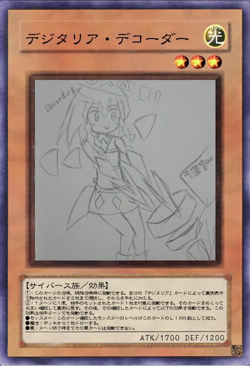 デコーダー効果は確認したセットされたカードによって効果が変わります。モンスターだとそのレベル分のLINKとして扱う効果。月の書等を利用すれば上級モンスター分のLINKを得られるかなりのリンク素材となれます。魔法ならただのドロー、罠ならターン中その罠を封じることができるとやたら万能なデジタリア。」(2017-06-25 13:29)