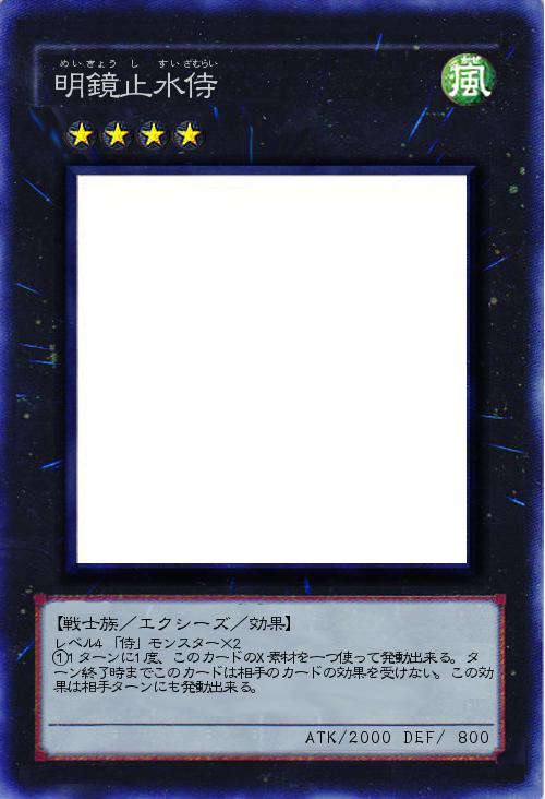 | レベル4「侍」モンスター×2 ①1ターンに1度、このカードのX素材を一つ使って発動出来る。ターン終了時までこのカードは相手のカードの効果を受けない。この効果は相手ターンにも発動出来る。 | |||