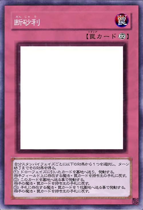 | 自分スタンバイフェイズごとに以下の効果から1つを選択し、ターン終了までその効果を得る。 ①:ドローフェイズに引いたカードを墓地へ送り、発動する。 相手フィールド上に存在する魔法・罠カードを持ち主の手札に戻す。 ②:このカードを墓地へ送る事で発動する。 相手の魔法・罠カードを持ち主の手札に戻す。 ③:手札に存在する魔法・罠カードを1枚墓地へ送る事で発動する。 相手の魔法・罠カードを持ち主の手札に戻す。 | |||