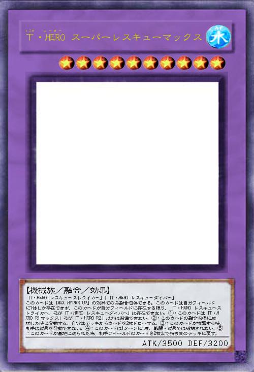 | 「T・HERO レスキューストライカー」+「T・HERO レスキューダイバー」 このカードは「MAX HYPER UP」の効果でのみ融合召喚できる。このカードは自分フィールドに1体しか存在できず、このカードが自分フィールドに存在する限り、「T・HERO レスキューストライカー」及び「T・HERO レスキューダイバー」は存在できない。①:このカードは「T・HERO R1マックス」及び「T・HERO R2」以外は装備できない。②:このカードの融合召喚に成功した時に発動する。自分はデッキからカードを2枚ドローする。③:このカードが攻撃する時、相手は効果を発動できない。④:このカードは1ターンに1度、戦闘・効果では破壊されない。⑤:このカードが墓地に送られた時、相手フィールドのカードを2枚まで持ち主のデッキに戻す。 | |||