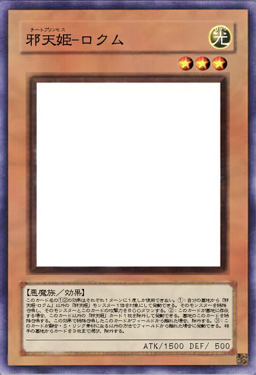 | このカード名の①②の効果はそれぞれ1ターンに1度しか使用できない。①:自分の墓地から「邪天姫-ロクム」以外の「邪天姫」モンスター1体を対象にして発動できる。そのモンスターを特殊召喚し、そのモンスターとこのカードの攻撃力を500ダウンする。②:このカードが墓地に存在する場合、このカード以外の「邪天姫」カード1枚を除外して発動できる。墓地のこのカードを特殊召喚する。この効果で特殊召喚したこのカードがフィールドから離れた場合、除外する。③:このカードが融合・S・リンク素材になる以外の方法でフィールドから離れた場合に発動できる。相手の墓地からカードを3枚まで選び、除外する。 | |||