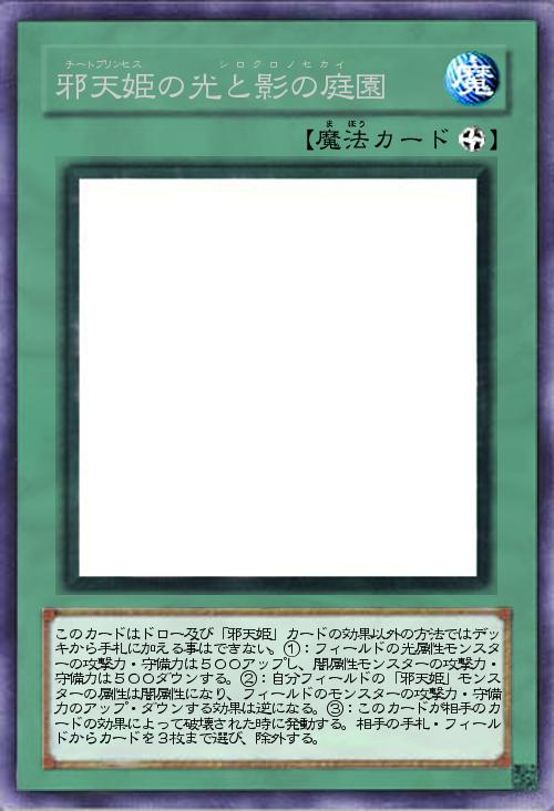 | このカードはドロー及び「邪天姫」カードの効果以外の方法ではデッキから手札に加える事はできない。①:フィールドの光属性モンスターの攻撃力・守備力は500アップし、闇属性モンスターの攻撃力・守備力は500ダウンする。②:自分フィールドの「邪天姫」モンスターの属性は闇属性になり、フィールドのモンスターの攻撃力・守備力のアップ・ダウンする効果は逆になる。③:このカードが相手のカードの効果によって破壊された時に発動する。相手の手札・フィールドからカードを3枚まで選び、除外する。 | |||