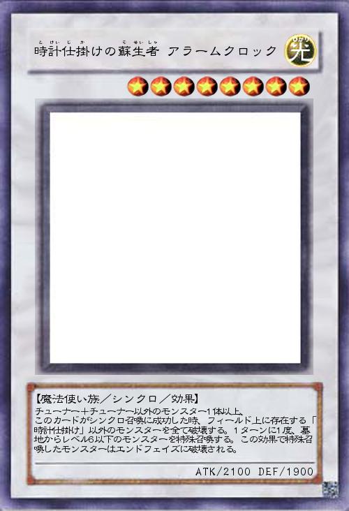 | チューナー+チューナー以外のモンスター1体以上、 このカードがシンクロ召喚に成功した時、フィールド上に存在する「時計仕掛け」以外のモンスターを全て破壊する。1ターンに1度、墓地からレベル6以下のモンスターを特殊召喚する。この効果で特殊召喚したモンスターはエンドフェイズに破壊される。 | |||