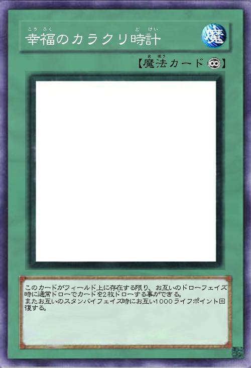 | このカードがフィールド上に存在する限り、お互いのドローフェイズ時に通常ドローでカードを2枚ドローする事ができる。 またお互いのスタンバイフェイズ時にお互い1000ライフポイント回復する。 | |||