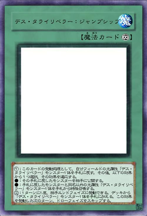| ①;このカードの発動処理として、自分フィールドの光属性「デス・タライリベラー」モンスター1体を手札に戻す。その後、以下の効果から1つ選択、その効果を適応する。 ●:その手札に戻したモンスターを相手に公開する。 ●:手札に戻したモンスターと同名以外の光属性「デス・タライリベラー」モンスター1体を手札から特殊召喚する。 ②:1ターンに1度、相手エンドフェイズに発動できる。デッキから「デス・タライリベラー」モンスター1体を手札に加える。この効果を発動した次のターン、ドローフェイズをスキップする。 | |||