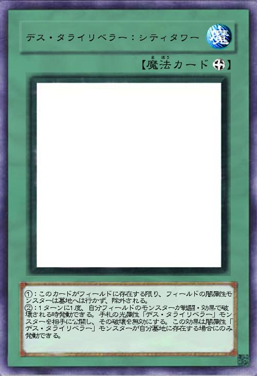 はい。「電遊」と並列して進める「デス・タライリベラー」です。五枚目は、ガーディアンの拠点である「City tower」。効果は闇属性除去とモンスターの疑似破壊耐性。光デス・タライリベラーの効果条件も満たせます(持ってる奴はまだGhost shellだけだけど)。