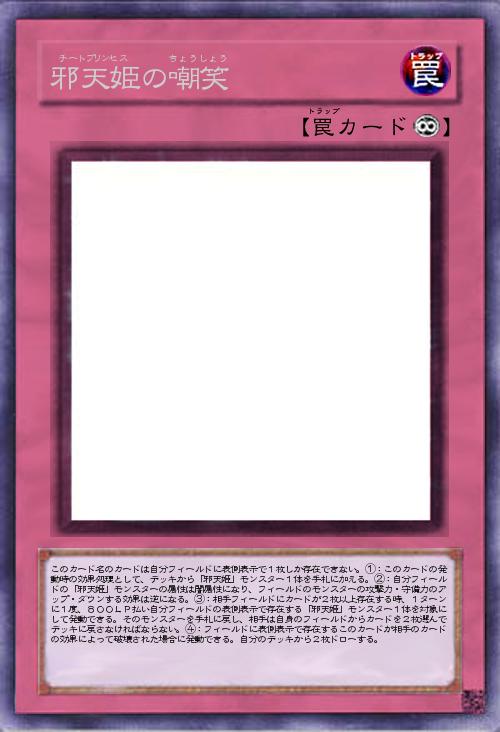 | このカード名のカードは自分フィールドに表側表示で1枚しか存在できない。①:このカードの発動時の効果処理として、デッキから「邪天姫」モンスター1体を手札に加える。②:自分フィールドの「邪天姫」モンスターの属性は闇属性になり、フィールドのモンスターの攻撃力・守備力のアップ・ダウンする効果は逆になる。③:相手フィールドにカードが2枚以上存在する時、1ターンに1度、800LP払い自分フィールドの表側表示で存在する「邪天姫」モンスター1体を対象にして発動できる。そのモンスターを手札に戻し、相手は自身のフィールドからカードを2枚選んでデッキに戻さなければならない。④:フィールドに表側表示で存在するこのカードが相手のカードの効果によって破壊された場合に発動できる。自分のデッキから2枚ドローする。 | |||