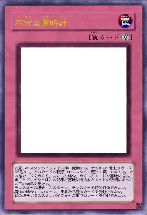 | お互いのスタンバイフェイズ時に発動する。デッキの1番上のカードを選択し、そのカードの種類(モンスター・魔法・罠)を当てる。その後カードをめくり、当たった場合、めくったカードを墓地に送る。当てたプレイヤーはこの効果で墓地に送られたカードの種類によって以下の効果を受ける。 モンスターの場合:このターン、モンスターを特殊召喚できない。 魔法の場合:このターン、手札から魔法カードを発動できない。 罠の場合:次のスタンバイフェイズまで罠カードを発動できない。 | |||