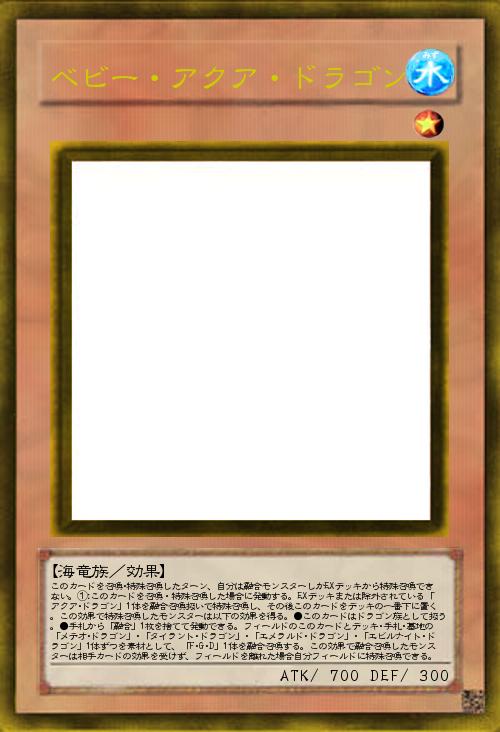 | このカードを召喚・特殊召喚したターン、自分は融合モンスターしかEXデッキから特殊召喚できない。①:このカードを召喚・特殊召喚した場合に発動する。EXデッキまたは除外されている「アクア・ドラゴン」1体を融合召喚扱いで特殊召喚し、その後このカードをデッキの一番下に置く。この効果で特殊召喚したモンスターは以下の効果を得る。●このカードはドラゴン族として扱う。●手札から「融合」1枚を捨てて発動できる。フィールドのこのカードとデッキ・手札・墓地の「メテオ・ドラゴン」・「タイラント・ドラゴン」・「エメラルド・ドラゴン」・「エビルナイト・ドラゴン」1体ずつを素材として、「F・G・D」1体を融合召喚する。この効果で融合召喚したモンスターは相手カードの効果を受けず、フィールドを離れた場合自分フィールドに特殊召喚できる。 | |||