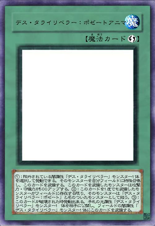 | ①:除外されている闇属性「デス・タライリベラー」モンスター1体を選択して発動できる。そのモンスターを自分フィールドに特殊召喚し、このカードを装備する。このカードを装備したモンスターは攻撃力・守備力が500アップする。②:このカードを1度でも装備したモンスターがフィールドに存在する限り、そのモンスターは「デス・タライリベラー:ポゼート」と名のついたモンスターとして扱う。③:このカードが破壊された時発動出来る。手札の光属性「デス・タライリベラー」モンスター1 体を相手に公開し、フィールドの闇属性「デス・タライリベラー」モンスター1体にこのカードを装備する。 | |||