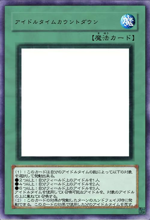 | (1):このカードは自分のアイドルタイムの数によって以下の対象を選択して発動出来る。 ●2つ以上:自分フィールド上のアイドルを1人 ●4つ以上:自分フィールド上のアイドルを2人 ●6つ以上:自分フィールド上のアイドルを3人 アイドルタイムを使用してX召喚可能なアイドルを、対象のアイドルの上に重ねてX召喚する。 (2):このカードの効果が発動したターンのエンドフェイズ時に発動できる。このカードの効果で使用した分のアイドルタイムを戻す。 | |||