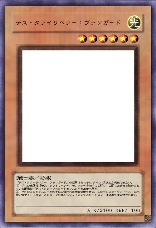| 「デス・タライリベラー:ヴァンガード」の効果はそれぞれ1ターンに1度しか発動できない。 ①:手札の光属性「デス・タライリベラー」モンスターを相手に公開し、公開した分まで除外されている闇属性「デス・タライリベラー」モンスターを墓地へ戻す。 ②:手札のこのモンスターが相手に公開された場合発動できる。このモンスターをフィールドに特殊召喚する。その後、このターンのエンドフェイズまでこのモンスターは効果では破壊されない。 | |||
